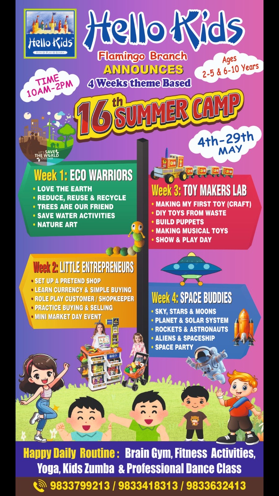 Weβre excited to announce our *4-week, theme-based 16th Summer Camp* β a perfect blend of learning, exploration, and fun for your little ones! π¨π - making every single day exciting and meaningful. From becoming eco heroes π to running mini businesses πΌ, crafting toys π§Έ, and exploring outer space πβyour child is in for an unforgettable journey!