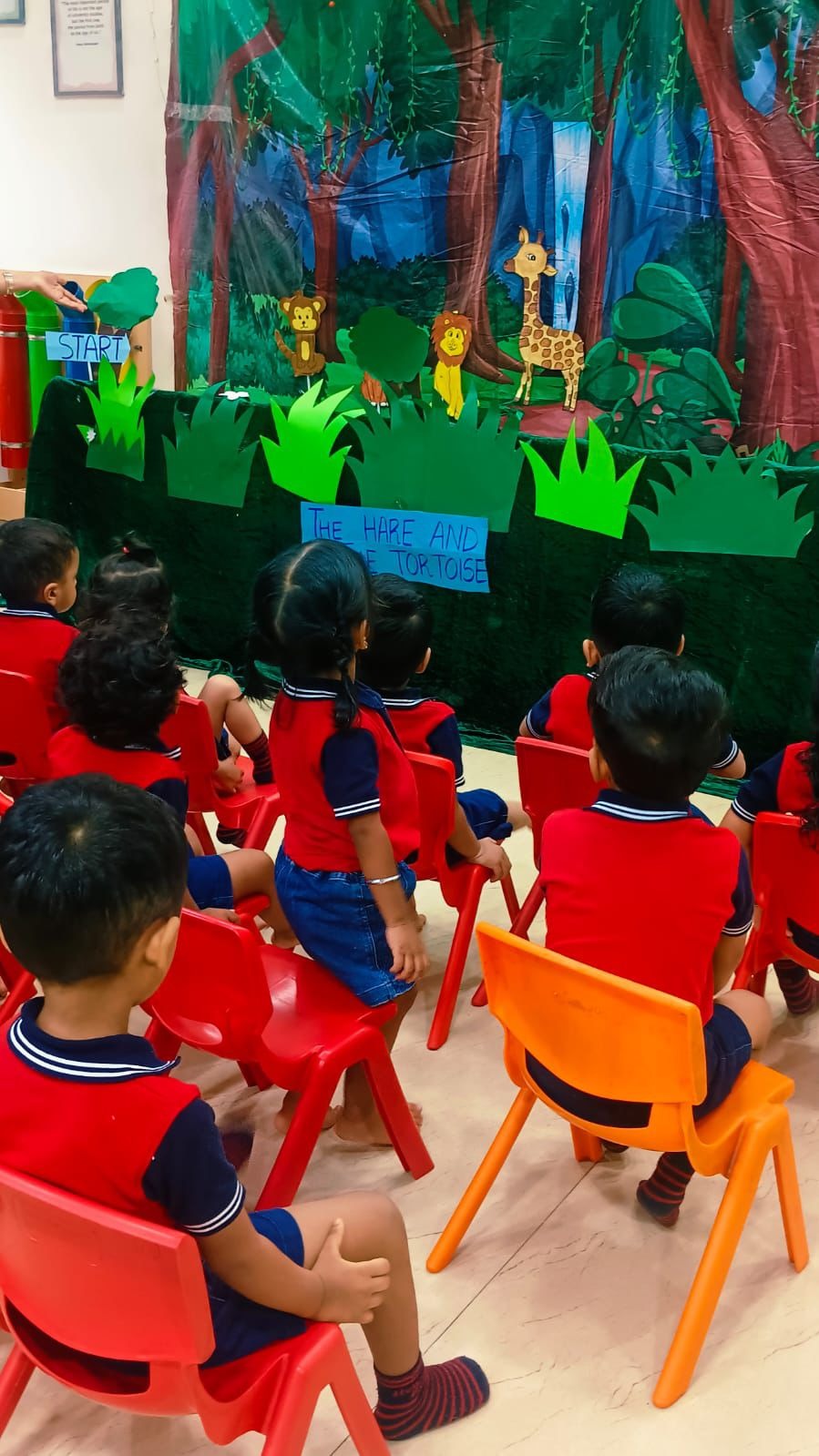 Teachers use colourful display boards, props, and puppets to visually present characters, scenes, and story sequences. This method helps children better understand the storyline while keeping them actively involved throughout the session.