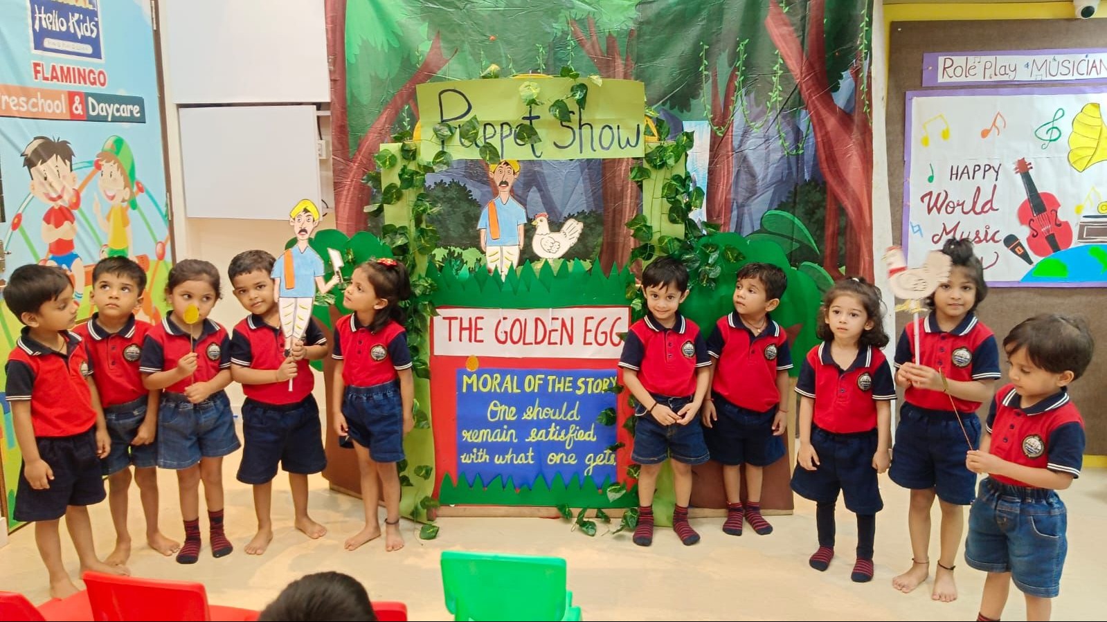 At Hello Kids Flamingo Preschool, children enjoyed a delightful puppet show based on the classic story of The Goose That Laid the Golden Eggs. Through colourful puppets, expressive storytelling, and engaging narration, the story was brought to life in a fun and interactive way. The children watched with great excitement as the characters unfolded the story, helping them understand the sequence and meaning in an enjoyable manner. Puppet shows are an effective learning tool in early childhood education. This activity helped enhance listening skills, imagination, vocabulary, and comprehension while keeping the children actively engaged. The story also conveyed an important moral about patience and not being greedy, helping children learn valuable life lessons in a simple and relatable way. At Hello Kids Flamingo Preschool, storytelling through puppets makes learning lively and memorable, nurturing creativity, curiosity, and a love for stories among young learners.